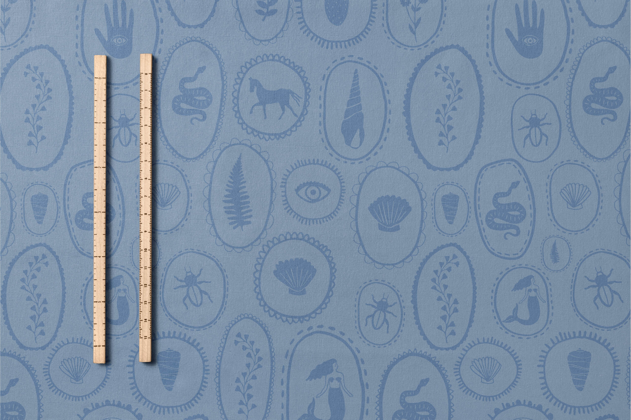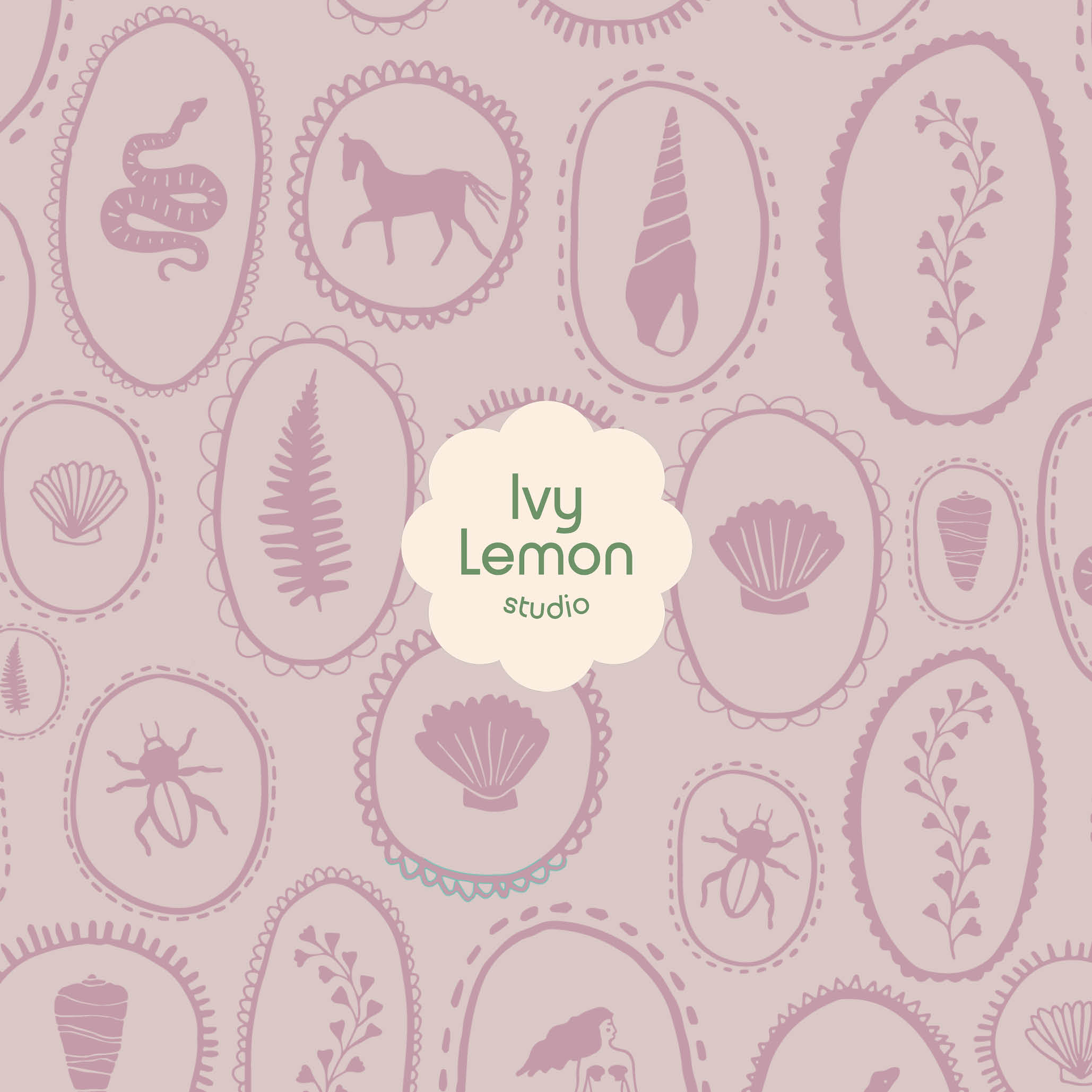 Fran PL057 is a whimsical and richly illustrated pattern featuring silhouettes of sea creatures, shells, foliage and forest animals; all enclosed within hand-drawn frames.
