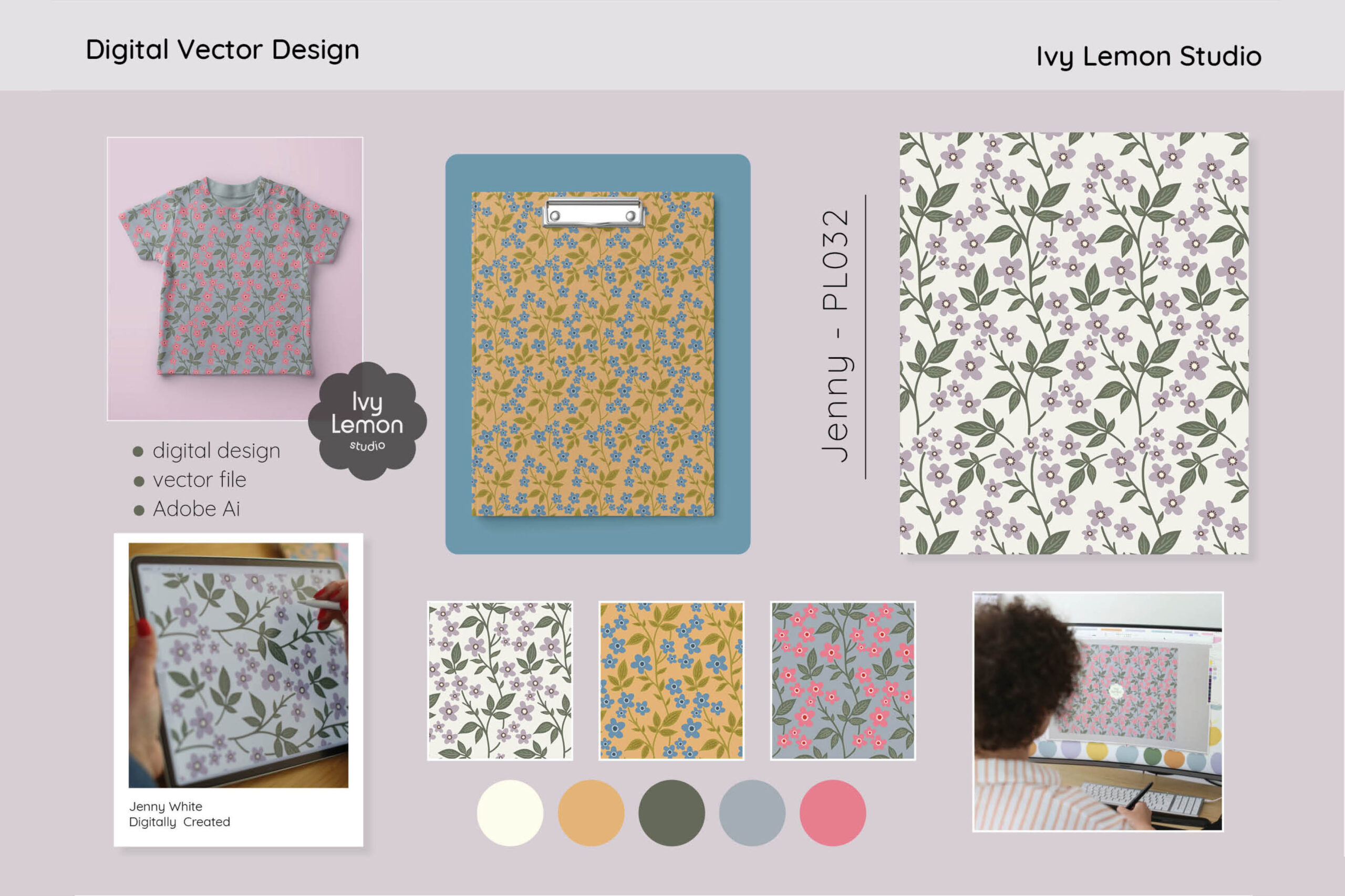 All our vector patterns are created first on an iPad Pro and then vectorised in Adobe Illustrator and worked up into a full repeat. Vector artwork can be resized infinitely without any loss of resolution or clarity, making it ideal for large or small products.