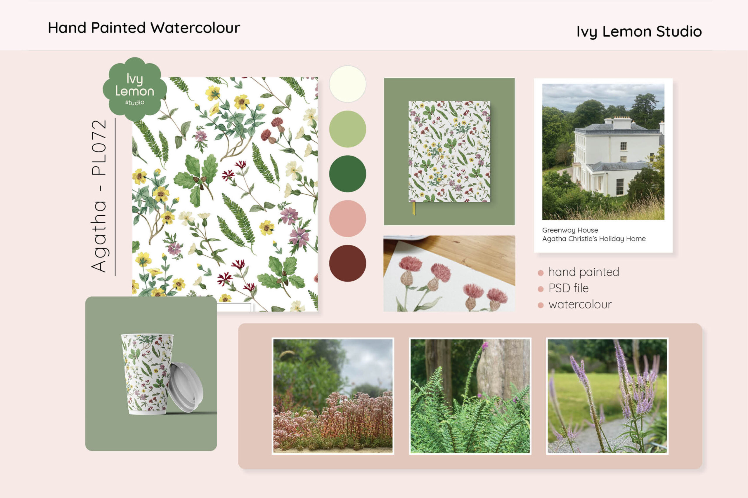 Agatha PL072 features hand-painted watercolour motifs inspired by the holiday home of Agatha Christie and her stunning garden. We love to be inspired by flora and fauna in the wild, and our watercolour repeat patterns begin with painting motifs.